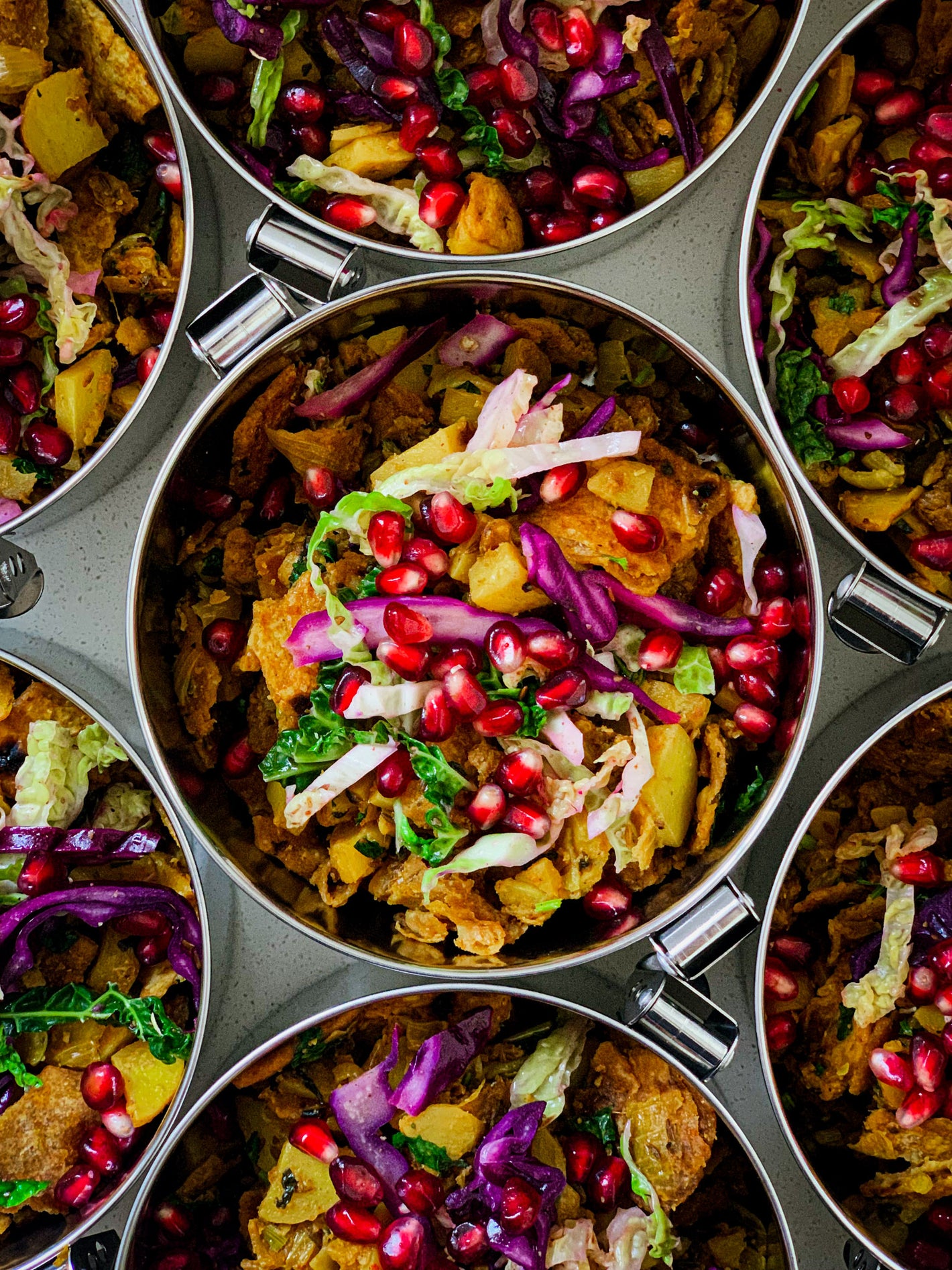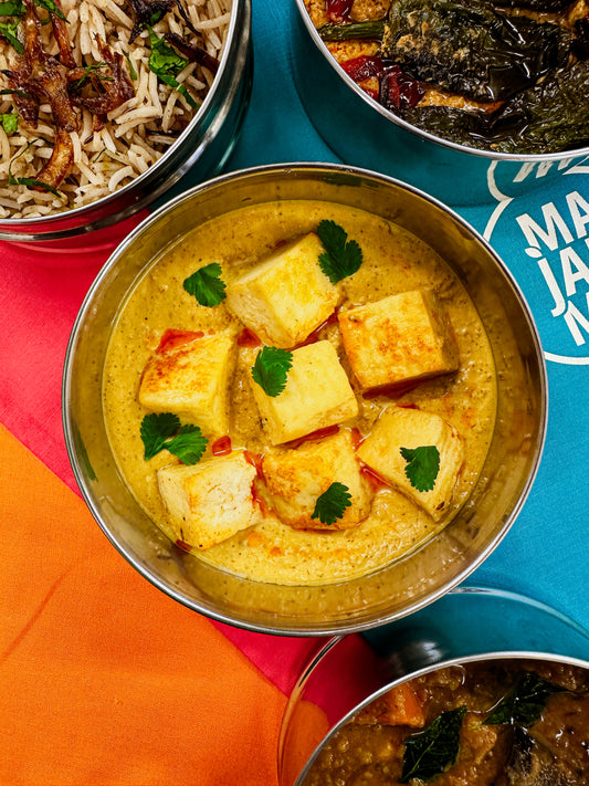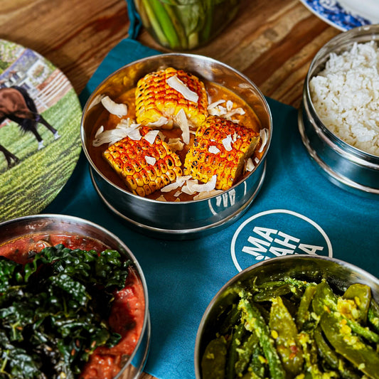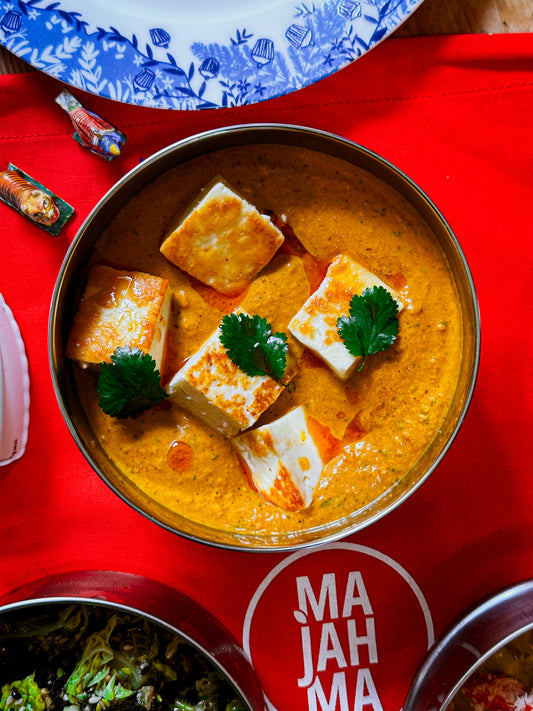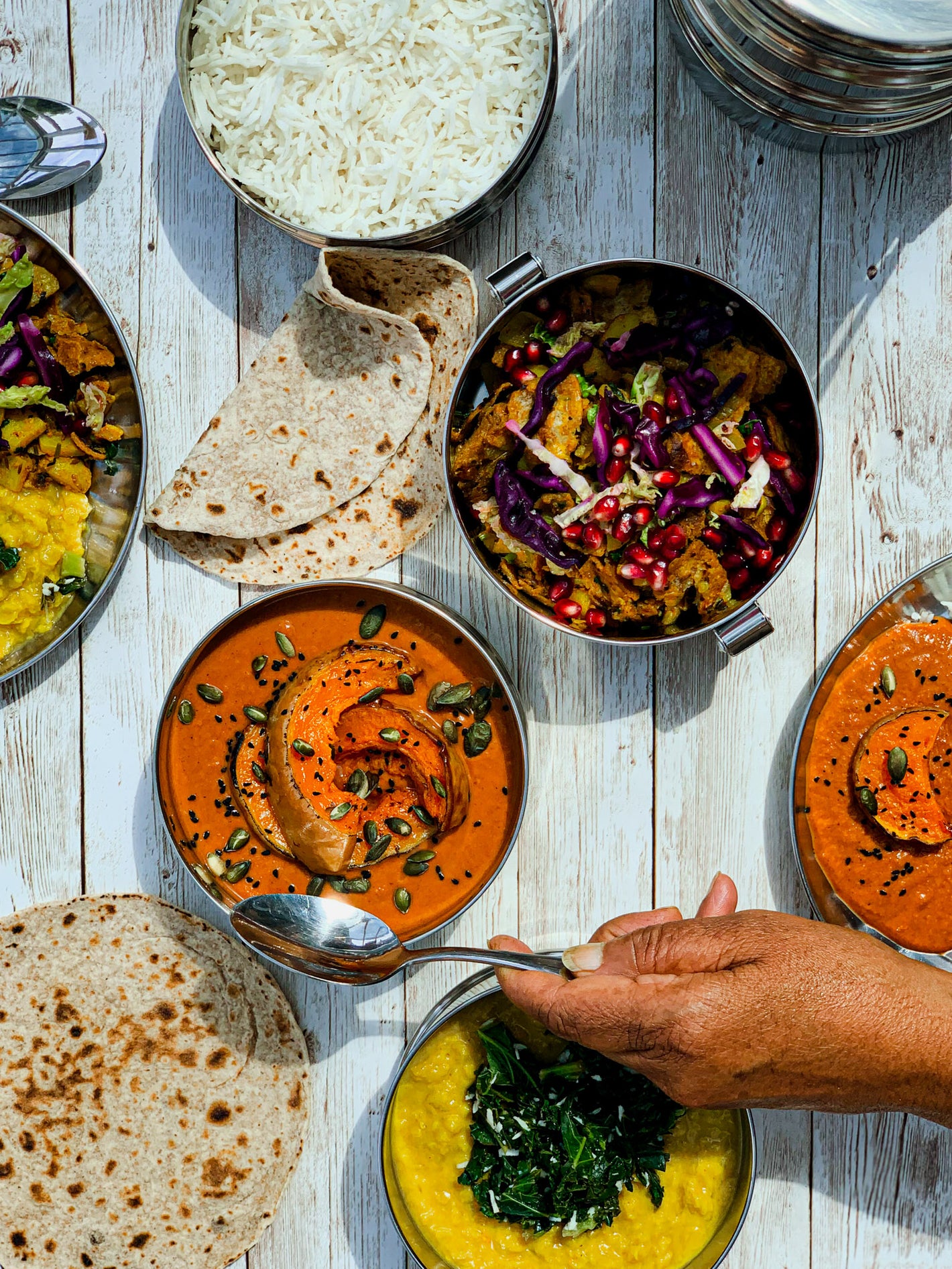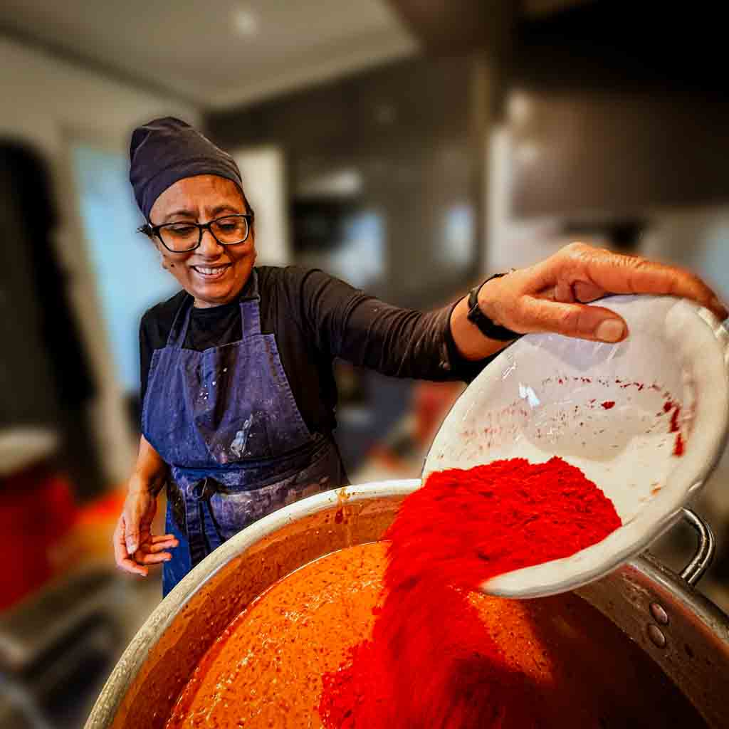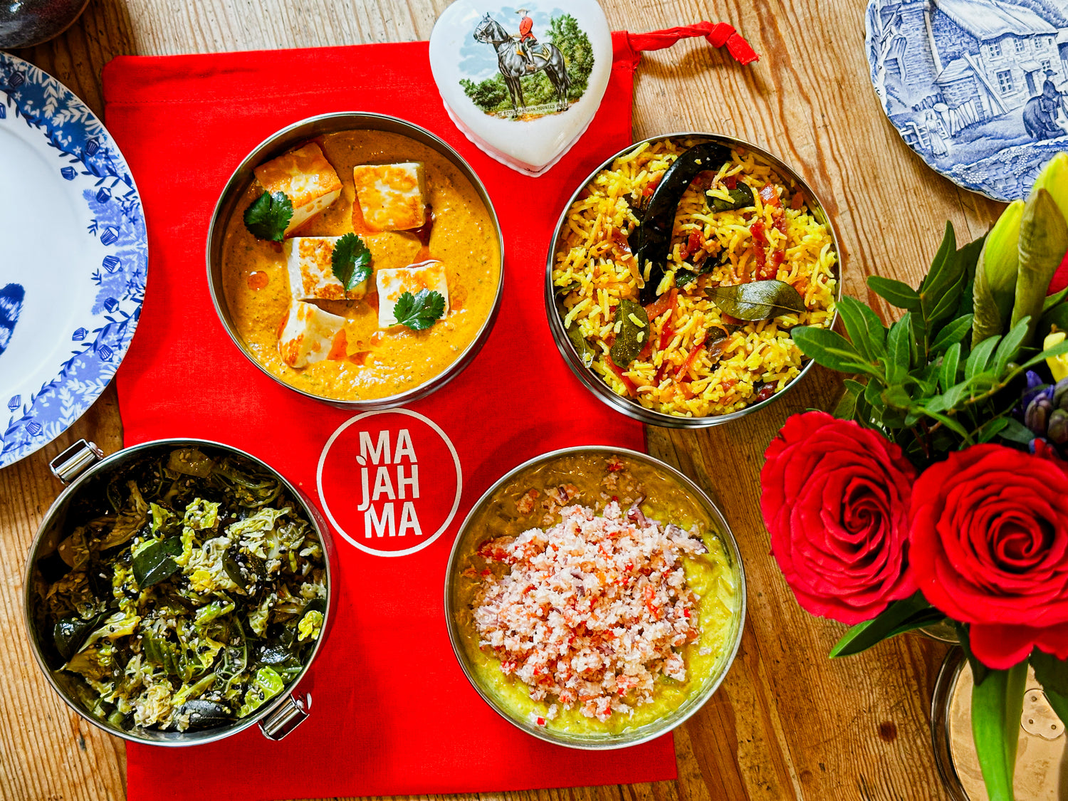 Roo was the youngest of 8 siblings, and learned to cook for her family at age 10 in when her mum fell ill. Moving to Brighton to be closer to her son Nish. She would often make Nish and Pip (Nish's wife) a flavour packed tiffin as a care package when they were working late. "Would you like a deliver-roo roo?" she would ask, Nish and Pip said yes. Soon more and more busy folk were keen for a beautiful night off, and Majahma was born.
