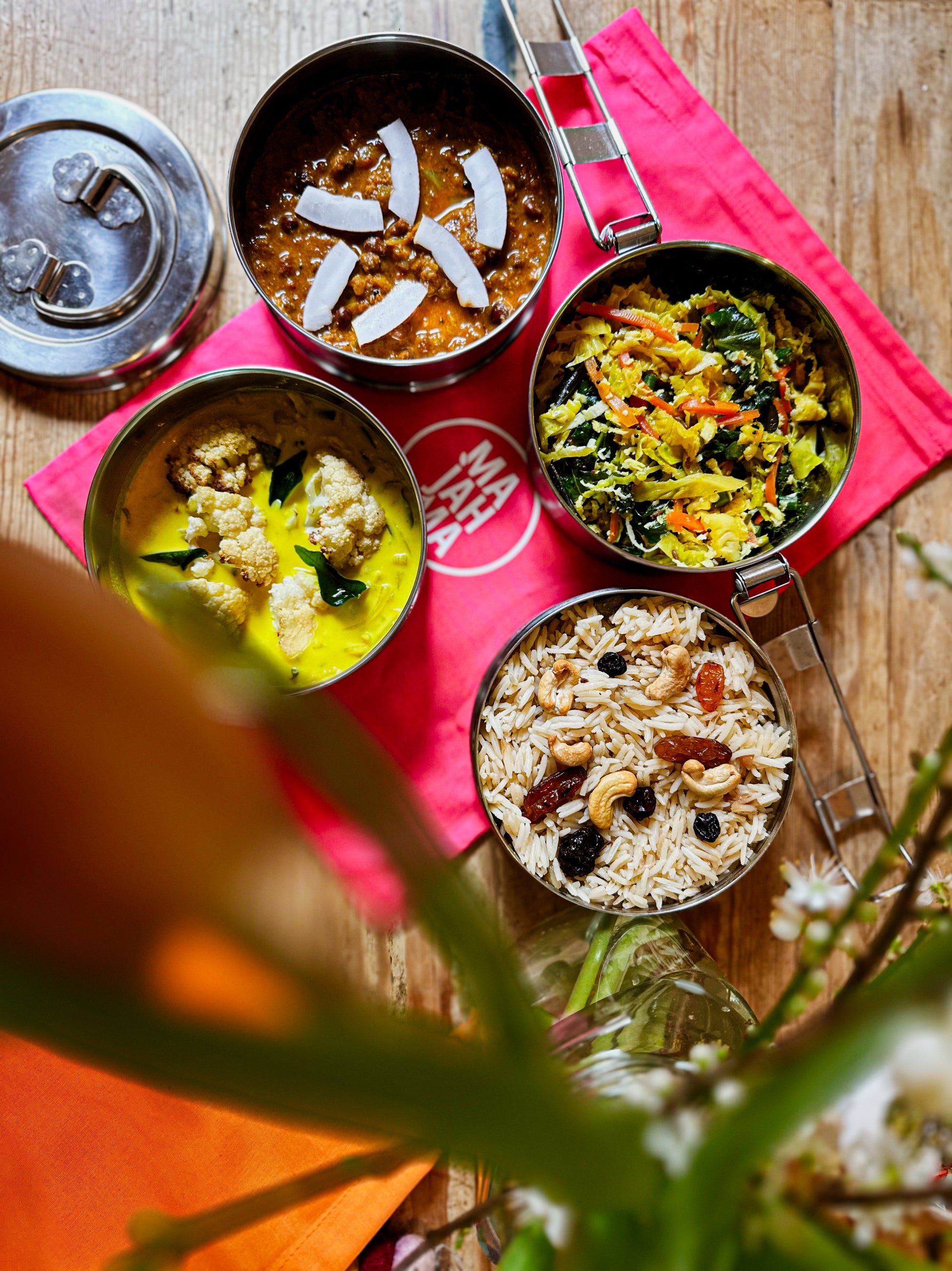 Delivered in a beautiful re-useable tiffin-tin* that we swap empty for full with every delivery.