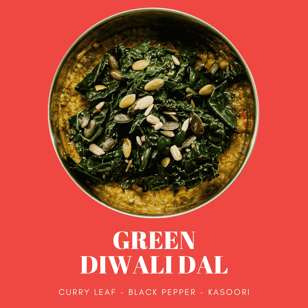 Earthy roasted moong dal tempered with cumin, garlic, and curry leaves and topped with fresh seasonal greens. Green is considered an auspicious colour at festival time.