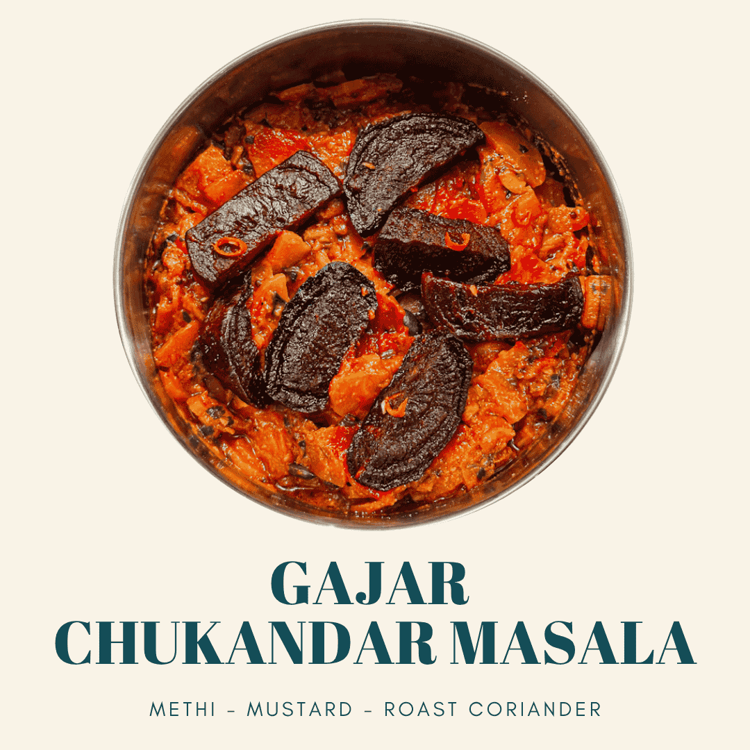Sweet carrot curry simmered in a spiced tomato masala and topped with earthy beetroot. A homely gujarati dish, vibrant in colour, gently spiced, and full of festive cheer.